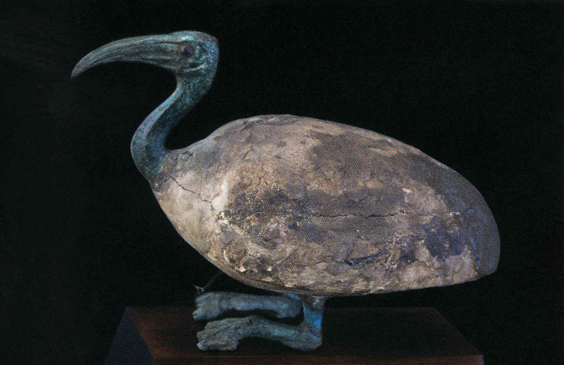 Coupe longitudinale : découverte d'une momie d'ibis à l'intérieur, la tête, dans l'axe de la tête en bronze.